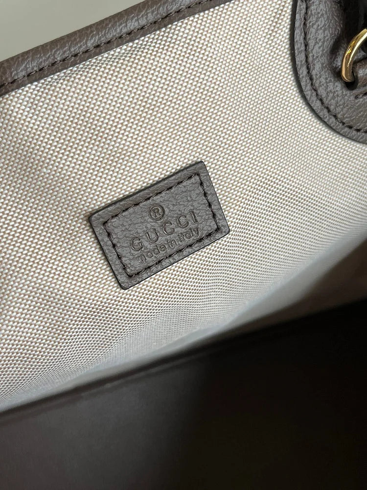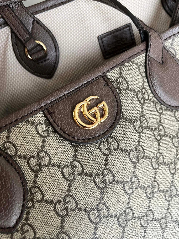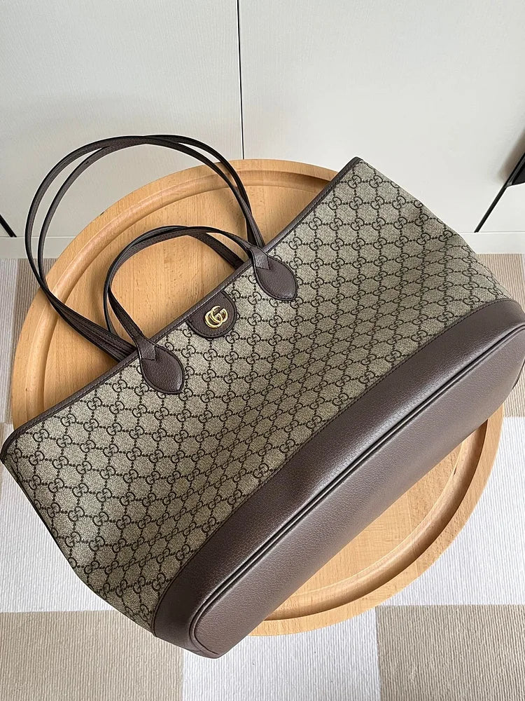 The Ophidia line continues to be one of Gc signature handbags. New silhouettes are introduced each season. providing versatile accessories to complete any look. Two handles transform this tote bag. allowing it to be styled either as a shoulder bag or top handle. The Double G remains integral to the design. presented in GG Supreme canvas with a brown leather trim.