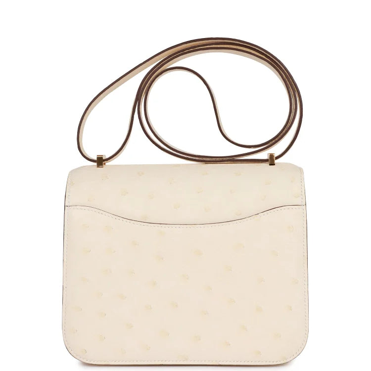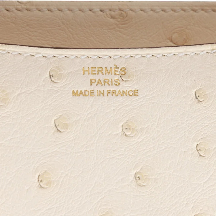 This Constance is ofNata ostrich withgold hardware and featurestonal stitching. a ‘H’ snap lock closure. and an adjustable shoulder strap.