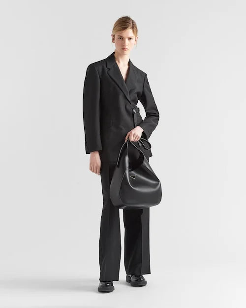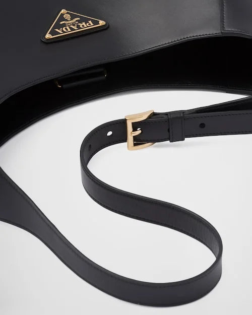 A bold and refined silhouette characterizes this leather shoulder bag with fine details. The geometric construction contrasts with soft lines to create a modern and elegant yet sporty bag. an expression of the hybrid concept and part of the Prada’s aesthetic code.