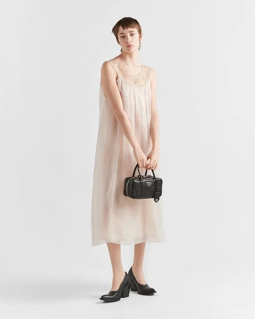 This bag with casual. classic allure is made of glossy nappa leather with a natural finish. The handmade wrinkled effect contrasts with the concept of a rigid construction. reinterpreting an everyday object that can be worn without constraints. Presented for the Spring Summer 2023 collection. the accessory that is a re-edition of a bag presented in 2001 is decorated with the enameled metal triangle logo.